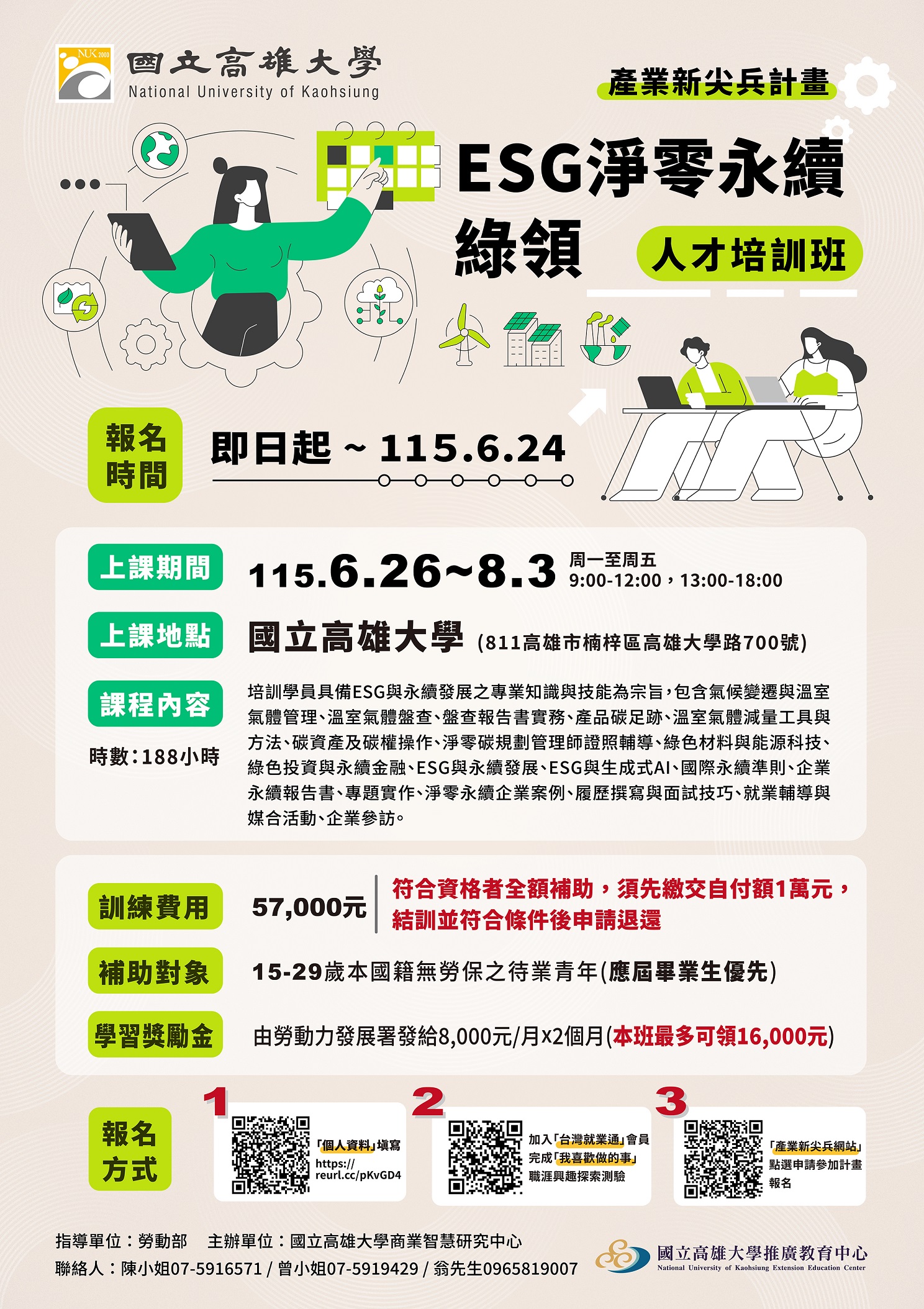 課程內容:培訓學員具備ESG與永續發展之專業知識與技能為宗旨,包含氣候變遷與溫室氣體管理、溫室氣體盤查、盤查報告書實務、產品碳足跡、溫室氣體減量工具與方法、碳資產及碳權操作、淨零碳規劃管理師證照輔導、綠色材料與能源科技、綠色投資與永續金融、ESG與永續發展、ESG與生成式AI、國際永續準則、企業永續報告書、專題實作、淨零永續企業案例、履歷撰寫與面試技巧、就業輔導與媒合活動、企業參訪