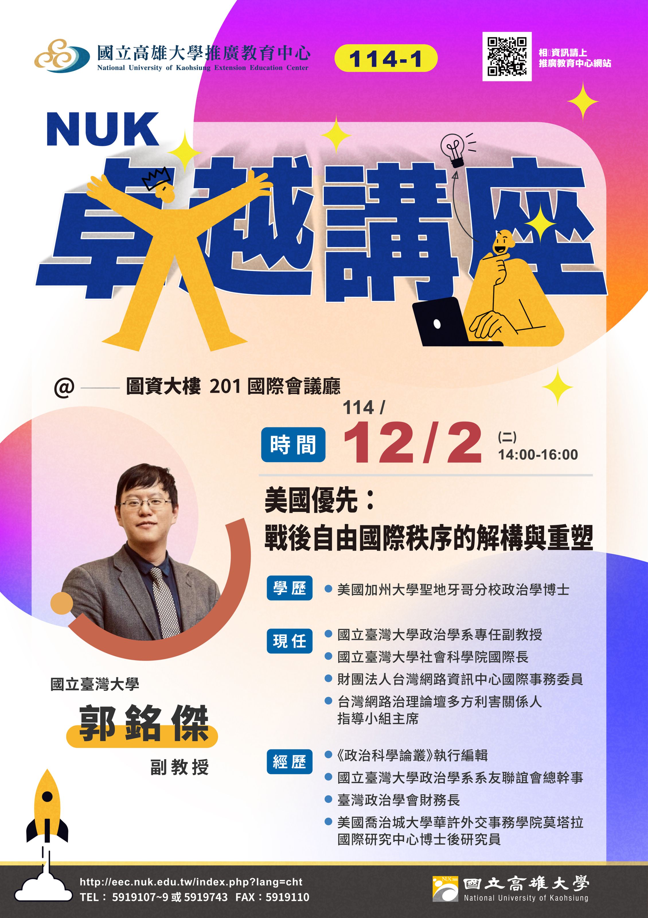 【卓越講座】12月02日敬邀臺灣大學﹝郭銘傑副教授﹞蒞臨演講。